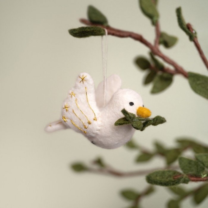 Vredesduif van vilt, met een olijftakje in zijn snavel. Er zit een touwtje aan, zodat je hem kunt ophangen.